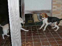 | 餌を食べ終わったところで、主人が名無しのビーグル君を塀の外に出した のだが、彼は僕のことが気になっていたらしく、隣の家の庭に入って、塀の上 から僕を覗くんだ。こうして、彼はときどき、塀の上から僕ん家を覗きながら 一晩中となりの家の庭で過ごしていたのだ。 |
