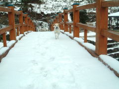 | 寒い今日はさすがに誰もいない。僕は思いっきりほたる橋周辺を走り回った。 雪の日はなんか変な感じがするのは、きっと雪のために色んな匂いが消され ているからかな。それで、僕は思いきり僕の匂いを撒き散らしてきたんだ。でも、 雪の上におしっこかけるのって、なんか面白い。くせになりそう。 |