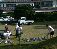 | 突然,草刈り部隊の急襲を受ける 例によって浅い眠りのまま朝を迎えた。午前6時,一人でコーヒーを飲んでいても廻りの目が気になる。早く 撤収しなければと思っていると,7時頃になって数人の男たちが軽トラックでやってきた。それぞれ草刈り機を 携えている。その中の一人に,「すみません,急にパンクしたもので勝手にここでキャンプを・・・」と言いかけ ると,「いやいやー,折角のところを,ゆっくりできんですまないね。」と薩摩なまりの優しい言葉にやれやれ一 安心である。「すみません,ここは何町ですか?」という問いに「ここ?ここは川辺(かわなべ)町よ」という答 えだった。(鹿児島県川辺郡川辺町,この町は,近いうちに周辺の知覧町,頴娃町と合併するようだ。) 聞くと,今日の夜この公園で町の夏祭りがあるのでこうして草刈りをするということで,やがて,草刈り部隊は 五〜六十人の大部隊となり,最初から手分けされていたのが,1時間もかからないうちに草刈り完了。続いて テントの設営などの会場準備に移っている。この手際の良さに,この町の人々の日頃のコミュニケーションの 濃さが想像できるようだ。きっと夏祭りも和やかで楽しい一夜になったことだろう。 |