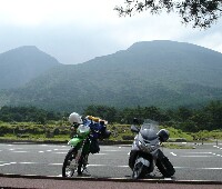 | えびの高原まで登ってみる 9時過ぎに民宿を出発してえびの高原をめざす。出発前に霧島天然水を民宿の人から分けてもらう。これで コーヒーを淹れるときっとおいしいはず。えびの高原までの距離は約25Km,約30分の行程である。快適な登り のコーナリングを楽しみながらと言いたいが,すこし左に傾けるとすぐにセンタースタンドがガガーと鳴くので, それなりに楽しみながら登っていく。 途中で,道路の右側に丸尾の滝という,小さな滝が見えたので小休止。小さな滝だが,玄武岩らしい節理の 岩盤から落ちる姿が絹のカーテンみたいで風情があった。さらに20分ほど登っていくとえびの高原に出た。 ここは,売店も休憩所もさびれた感じである。とりあえず有料駐車場にバイクを入れてコーヒーを入れる。ここ で一時雨模様になったこともあって少しゆったりと過ごす。 |
