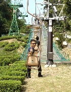 | 城に登るリフトにて | 漱石の「坊ちゃん」時代の女学生と記念撮影 | 城の櫓の一つをバックに |